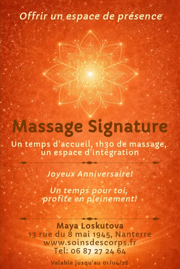 A la recherche d’un cadeau pour votre conjoint(e), n’hésitez pas plus longtemps, le toucher doux et intuitif de Maya lui fera passer un moment hors du temps et inoubliable.